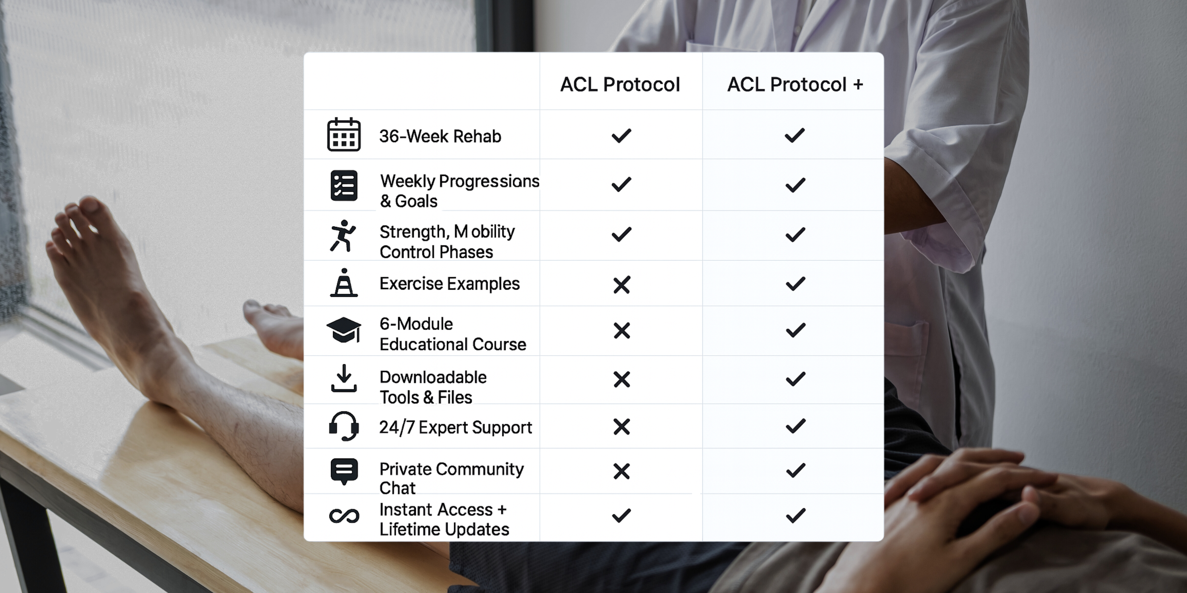 The basic ACL Protocol is a standalone program. It does not include coaching or community access — for expert support and more features, check out ACL Protocol +.